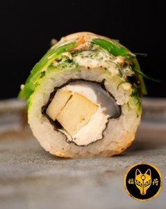 Нори, рис, тилапия, яблоко, сыр творожный, чука, соус кунжутный, кунжут